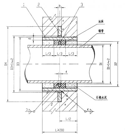 剛性防水套管適用于管道穿墻處不承受管道振動(dòng)和伸縮變形的構(gòu)(建)筑物,A型適用于鋼管。從圖中可以看到套管的管材厚度為δ,套管的外徑為D3,所穿的鋼管的外徑為D1。對(duì)應(yīng)于A型剛性防水套管的各個(gè)部位的尺寸。舉個(gè)例子,DN50的A型剛性防水套管,它的外徑為D3=114,而能夠穿的鋼管的外徑為D1=60。再舉個(gè)例子,DN80的A型剛性防水套管,它的外徑為D3=140,而能夠穿的鋼管的外徑為D1=89。鋼管的公稱(chēng)直徑與外徑的對(duì)照表,DN50的鋼管的外徑為57(B型),DN80的鋼管的外徑為89(B型)。(注:B型指國(guó)內(nèi)沿用系列<公制管>)